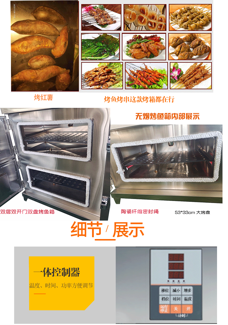 1.減少人工,320度恒溫烤制,避免人工操作的失誤,自動報警系統(tǒng),減少專門負責烤魚的操作人員/避免人為因素產(chǎn)生的烤制效果